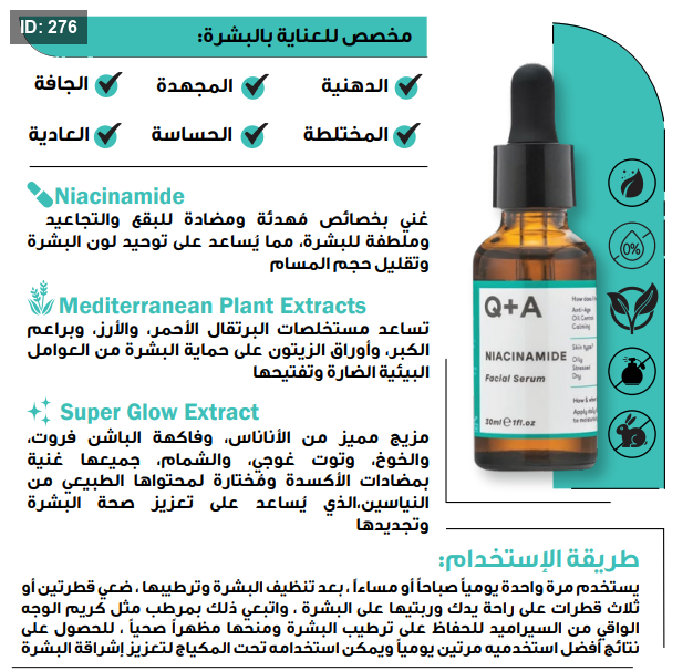 مخصص للعناية اليومية بالبشرة الدهنية والمجهدة والجافة والحساسة ُ والعادية والمختلطة بفضل تركيبته المشرقة التي تجمع بين النياسيناميد ُ المهدئ و الألانتوين المهدئ التي تساعد على حماية وتقوية حاجز البشرة وترطيبها وموازنة إفراز الزيوت البشرة وتفتيح لون البشرة وتعزيز توهجها وتقليل حجم المسام ومكافحة علامات التقدم بالسن