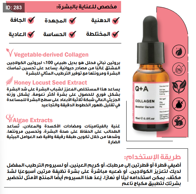 مخصص للعناية اليومية بالبشرة الدهنية والمجهدة والجافة والحساسة والعادية والمختلطة بفضل تركيبته الفريدة التي تحتوي على مزيج من الكولاجين النباتي، وبذور شجر العسل، ومستخلصات الطحالب، التي تساعد على شد البشرة و تنعيمها ومنحها مظهرا صحيا وتستهدف الخطوط الدقيقة بالبشرة وتكافح علامات التقدم بالسن وتنعم وتشد البشرة وتعزز انتاجها للكولاجين وترطيبها ً بعمق
