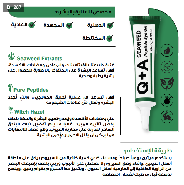 مخصص للعناية اليومية بمنطقة حول العيون للبشرة الدهنية والمختلطة والعادية والمجهدة بفضل تركيبته الفريدة الغنية ببتيدات الأعشاب البحرية، المدعم بببتيدات بناء الكولاجين والصبار العضوي المهدئ ، المصممة لتقليل التجاعيد وعلامات التقدم بالسن حول العينين وشد البشرة وترطيبها وتعزيز إنتاج الكولاجين ويمنح منطفة أسفل عينبك مظهراً مشدوداً وصحياً