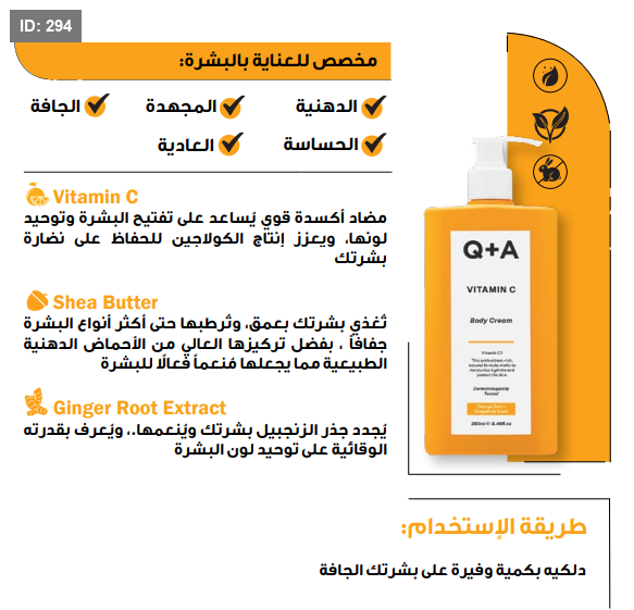 يعمل فيتامين C الغني بمضادات الأكسدة على تعزيز إشراقة البشرة ُ ونعومتها صمم هذا الكريم بزبدة الشيا و مستخلص جذر الزنجبيل للمساعدة في حماية البشرة وترطيبها، ويحتوي على مزيج فاخر من الزيوت الطبيعية سهلة الامتصاص لترطيب وتغذية عميقين للبشرة ، برائحة قشر البرتقال والجريب ُ فروت المنعشة والمنعشة مع نفحات البرتقال الحلو والليمون