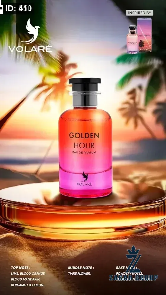 يجسّد عطر "غولدن آور" جوهر غروب الشمس الساحر، جامعًا بين حيوية الحمضيات وأناقة الأزهار. يفتتح العطر بنفحة منعشة من الليمون الحامض، والبرتقال الأحمر، واليوسفي الأحمر، والبرغموت، والليمون، ليخلق رائحة منعشة ومبهجة توقظ الحواس على الفور. في قلبه، تُضفي زهرة التياري الفاخرة لمسة زهرية استوائية كريمية، تُغمرك بدفئها وسحرها. يستقر العطر برقة في قاعدة ناعمة ومريحة من الروائح البودرية، والمسك، وخشب الصندل، ليمنحك عمقًا وإثارة تدومان على البشرة بجمال. يُعدّ "غولدن آور" مثاليًا لمن يبحثون عن رائحة مشرقة ومبهجة تُجسّد الفرح والرقي، مما يجعله رفيقًا مثاليًا للنهار والمساء.